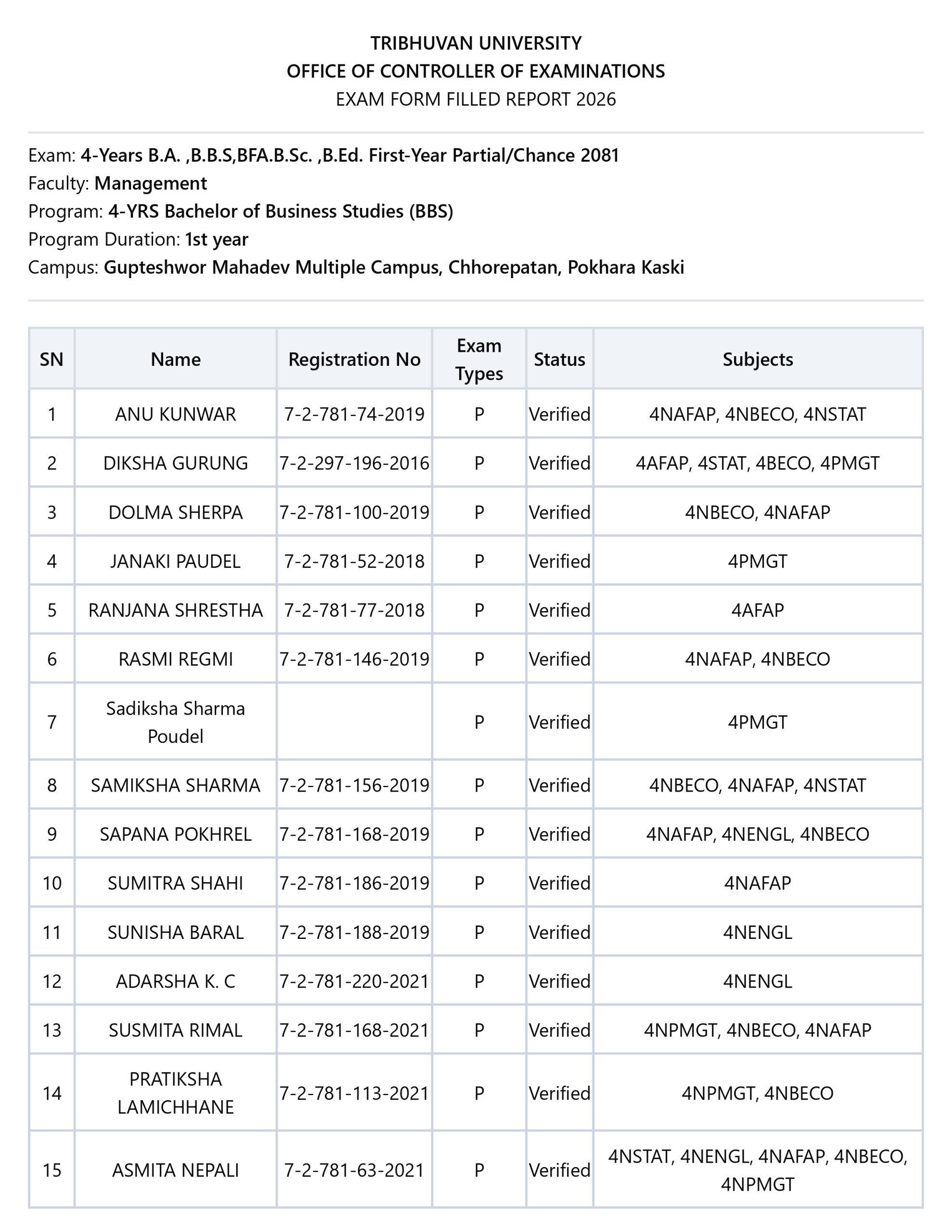BBS 2082 प्रथम वर्षको आशिंक परीक्षा आवेदन फारम भरेका विद्यार्थीहरुको सूची । फारम भर्न छुट भएका विद्यार्थीहरुले आज मिति २०८२ माघ ७ गते बेलुका ४ बजे सम्म क्याम्पसको परीक्षा शाखा बाट भर्न सकिनेछ । Gupteshwor Mahadev Campus2026-01-21T03:24:29+00:00Exam Form Filled List, Notice|