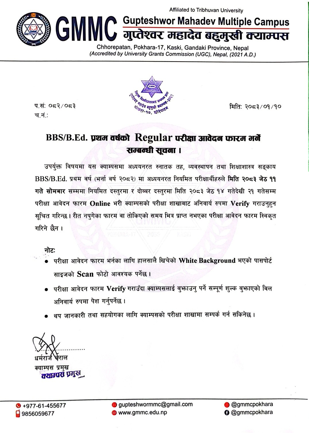 BBS /B.Ed प्रथम वर्षको नियमित परीक्षा आवेदन फारम भर्ने सम्बन्धी सूचना ।